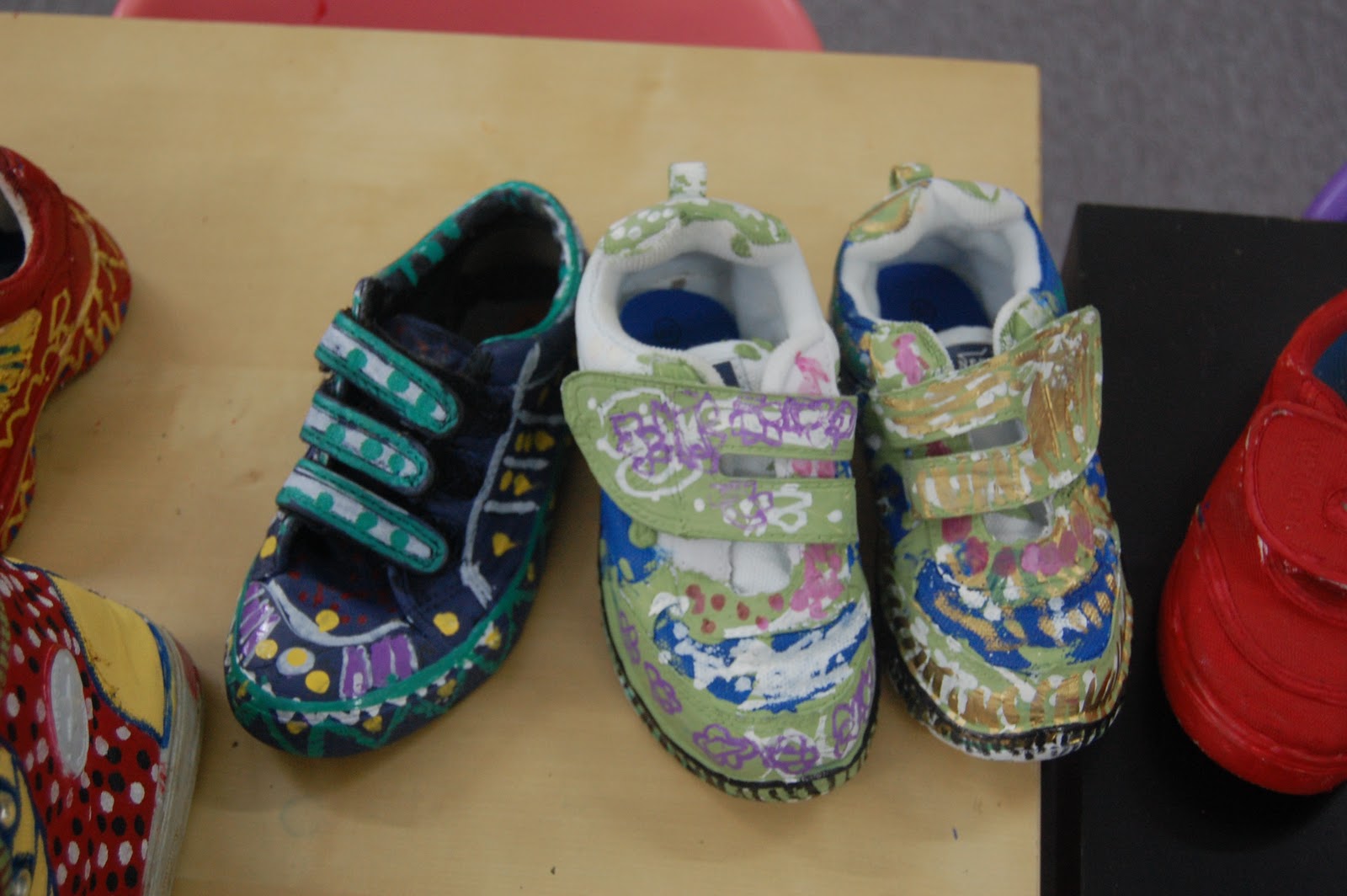 3. Hias kasut menggunakan pen Fluorescent Marker. Hias cantik-cantik dan kemas. Lukiskan corak-corak yang digemari.